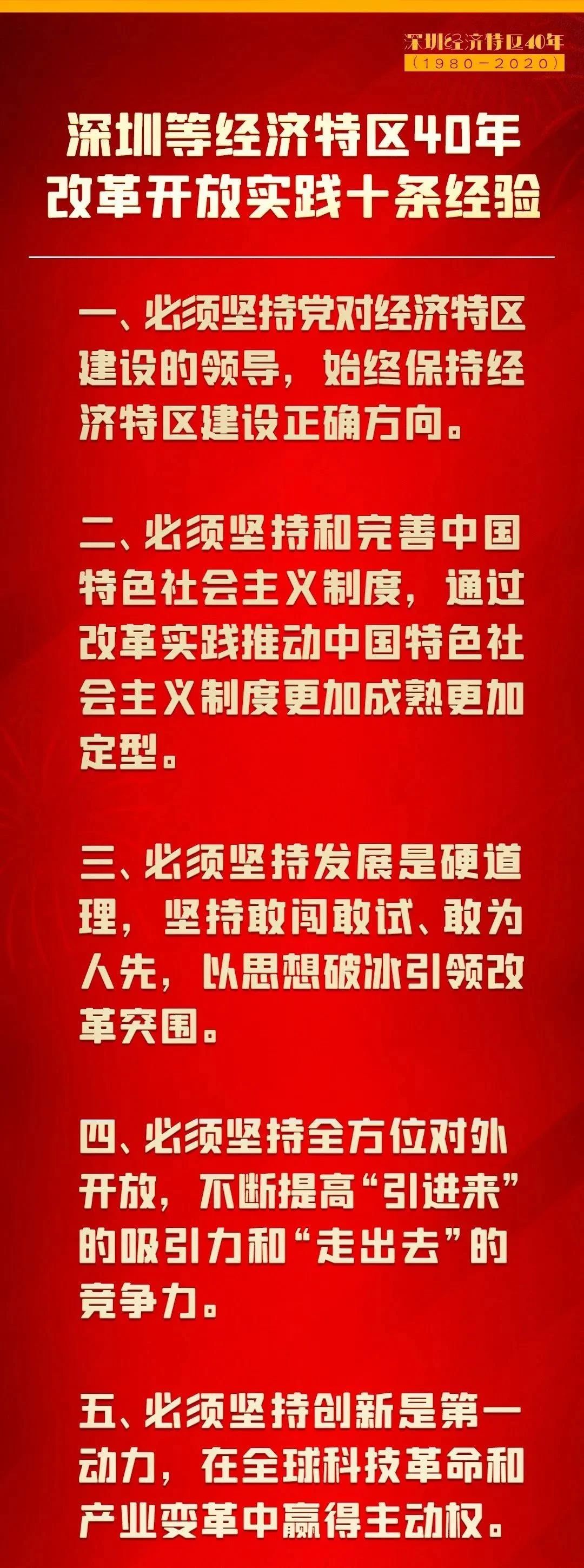 习总书记总结经济特区建设经验,指出深圳是改革开放后党和人民一手缔造的崭新城市,是中国特色社会主义在一张白纸上的精彩演绎。深圳广大干部群众披荆斩棘、埋头苦干,用40年时间走过了国外一些国际化大都市上百年走完的历程。这是中国人民创造的世界发展史上的一个奇迹。他指出深圳等经济特区的成功实践充分证明,党中央关于兴办经济特区的战略决策是完全正确的。经济特区不仅要继续办下去,而且要办得更好、办得水平更高。 深圳等经济特区40年改革开放实践,创造了伟大奇迹,积累了宝贵经验,深化了我们对中国特色社会主义经济特区建设规律的认识。