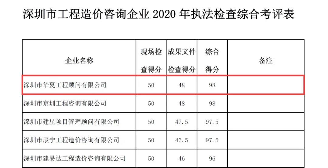 我司在深圳市工程造价咨询企业2020年执法检查中综合考评得分荣获第一,此次荣誉的获得离不开公司严密科学的质量管控制度和员工们专业的技术能力。未来,我司将一如既往地秉承“以信立业,以德兴业”的经营理念,继续执行深圳市建设工程计价标准和相关规范,以更加精湛的技术为客户提供工程造价咨询服务。