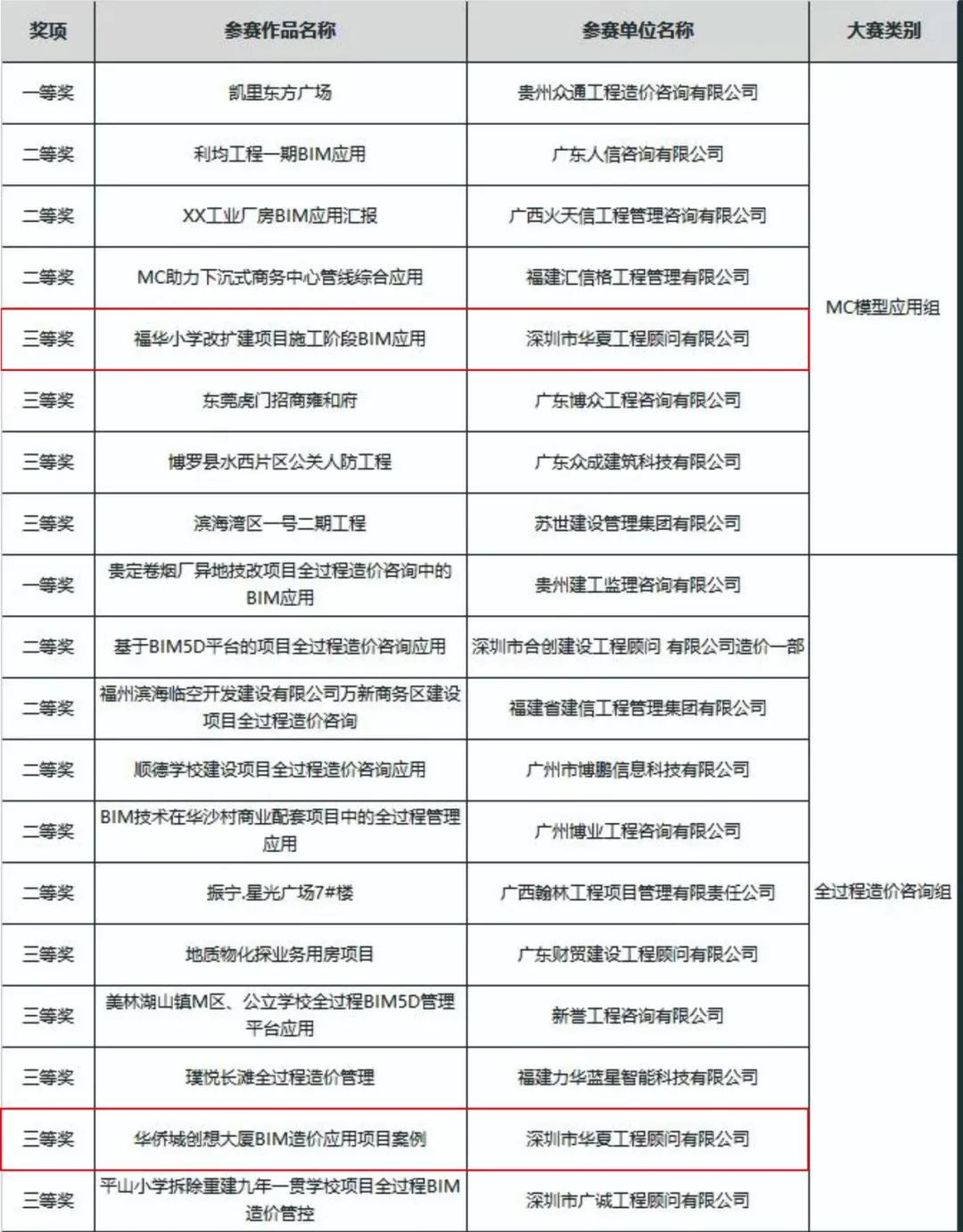 2020年8月20日,广联达科技股份有限公司主办第一届咨询企业BIM应用大赛。此次大赛,参赛单位来自全国各地,作品涵盖多种项目类型各个阶段的BIM应用。比赛评比通过入围审核、初审、答辩复审三个环节,结合项目BIM应用情况答辩得分及过程得分,经专家组共同评审,最终得出比赛成绩。我司BIM团队参赛作品“福华小学改扩建项目施工阶段BIM应用”及“华侨城创想大厦BIM造价应用项目案例”荣获“广联达首届咨询企业BIM应用大赛南部分赛区MC模型应用组、全过程造价咨询组三等奖。”华夏工程顾问BIM团队在MC模型应用组、全过程造价咨询组取得的奖项,是业内专业人士对华夏工程顾问BIM团队专业技术与能力的认可和肯定,我司将继续努力,不遗余力地实践基于BIM的建筑全生命周期的项目管理模式,通过BIM实施虚拟建造与实体结合的新型建筑项目管理方式,推动中国建筑产业转型升级。